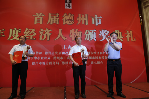 5月30日上午,首屆德州市年度經濟人物頒獎典禮在德州富豪康博酒店舉行,德州市委常委、常務副市長徐春福,德州市委常委、宣傳部長張傳忠,德州市人大副主任鐘玲,德州市政府副市長康志民,德州市政協副主席楊光來等領導出席,并為獲獎企業家頒獎,公司董事長秦慶平作為全市的十大經濟人物,受到了隆重表彰。