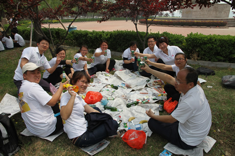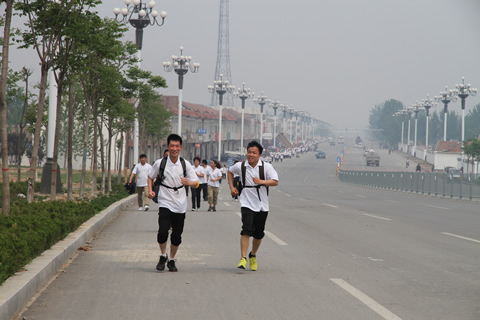 9:40,重新集結后,隨著一聲哨響,競賽正式拉開帷幕,參賽隊員攜帶各自用品,一路向南,途中,拉著,推著,鼓勵著,共同向前,有的唱起了《一二三四》歌,這是一次意志與耐力的考驗,更是一種團隊精神的體現。協助公司流程制度績效優化工作的北大縱橫的兩位老師聞訊后,欣然加入參賽隊伍,并跑完了全程。房莉,已近知天命之年,原本可以不參加此活動,但她主動要求,全程參與,取得了小伙子都自嘆不如的好成績。焦玉磊,體重100公斤,比賽途中,腿部出現了抽筋,但他硬是堅持跑至終點。11:48,在大家的歡呼聲中,28支隊伍240余人成功抵達紅心廣場,無一個人掉隊,勝利完成了15.2公里的新長征。