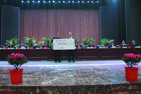 在2019年度總結表彰大會上,公司斥資115余萬元對涌現的先進單位和先進個人予以獎勵,尤其是新增的創新成果獎,對炭黑科技攻關小組一次獎勵20萬元,激發了全員創新熱情,營造全員創新氛圍,讓創新成為金能發展助力(圖為董事長為創新成果獎獲獎代表頒獎)。